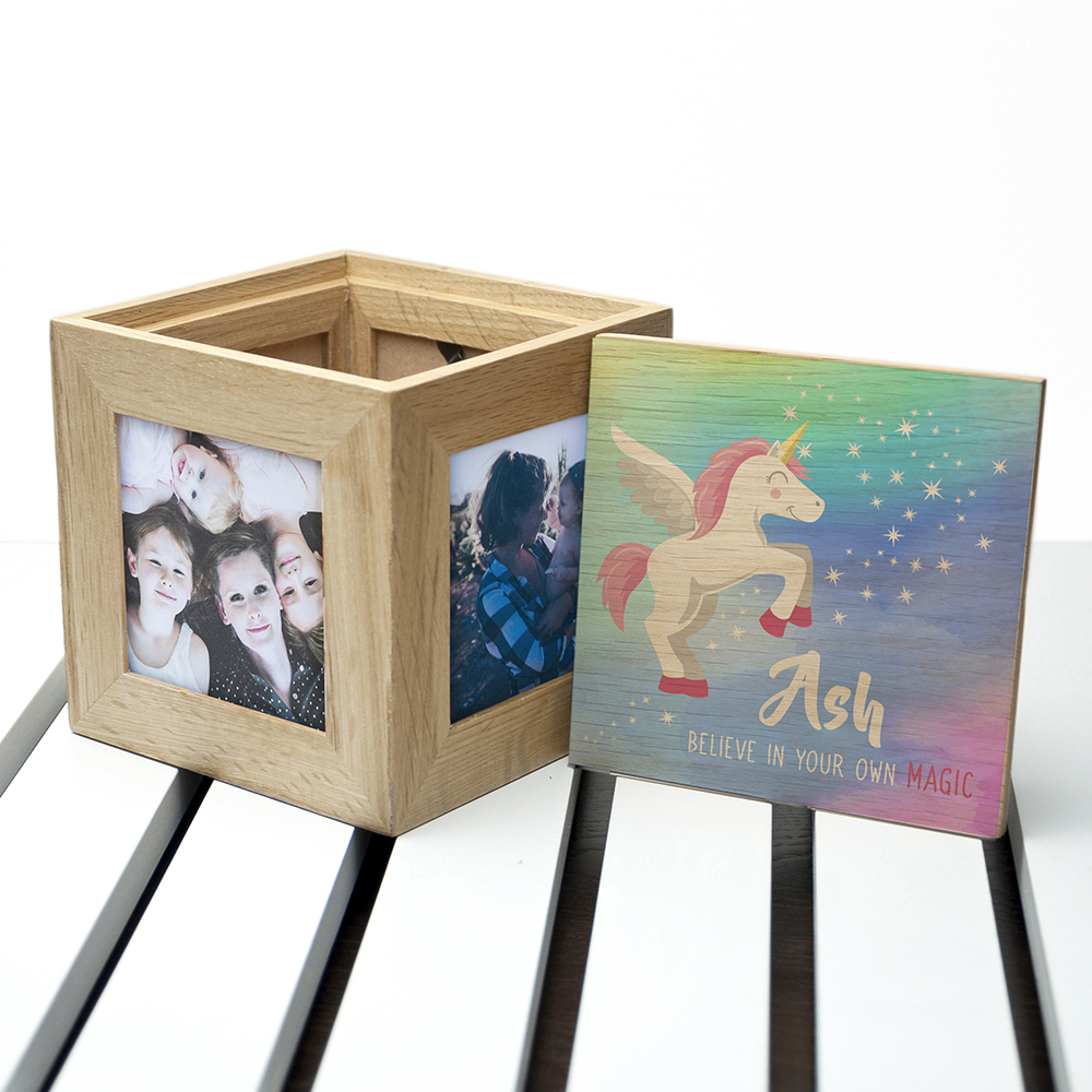 Use this beautiful oak engraved photo cube to store special keepsakes or valuables. A window on each side means you can display five photos of your choice that commemorate a special day. It’s an ideal gift or keepsake for special occasions.