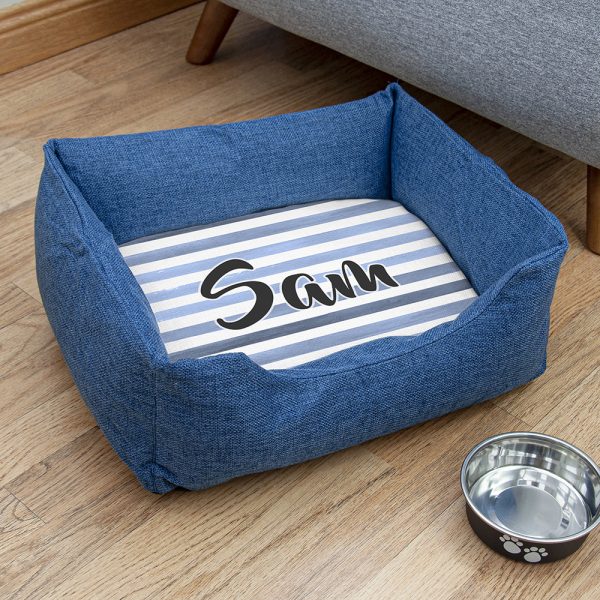 Show your furry bundle of joy some love with our Personalised Dog Bed with Blue Striped Design. This luxury pet bed is the perfect way to show them just how much you care, plus you can personalise it with a name of your choice to make it that extra bit special. Made from a linen-style blue canvas, this pet bed is sure to brighten up any room. It’s soft and durable, plus it has plush inner cushions that will give your pet their best night’s sleep ever! The black base means that it will stay looking clean for longer and the classy blue striped design is bound to suit any pet. Personalise your pet bed with a name of up to 12 characters, which our team of specialist craftspeople will print onto it in a bold script font, making it a special gift that’s just for your beloved pet. This bed is available in two sizes, with the smaller size being ideal for smaller dogs, cats and other pets, and the larger size designed for medium to large pets who need a little extra wiggle room.