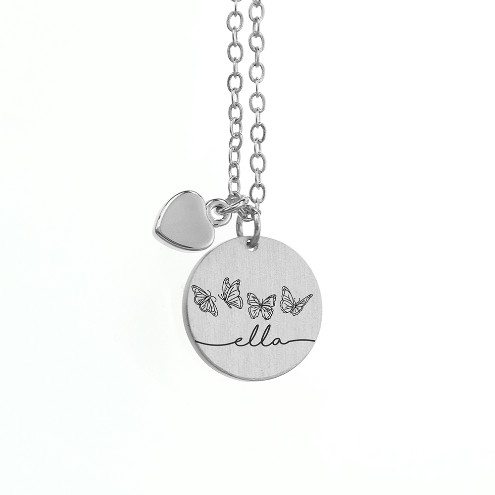 Searching for that perfect gift for a free-spirited friend or family member? Look no further! Our Personalised Butterfly Row Necklace is just what you need! Featuring a beautiful butterfly engraving, this necklace makes a wonderful gift for birthdays, for bridesmaid favours, or any occasion you could think of. Each necklace features a circular pendant with a sweet butterfly image alongside a name of your choice, plus a heart charm to show them just how much you love them. A lovely, unique accessory with an added personal touch, this necklace is sure to make them smile. You can personalise your necklace with a name of up to 10 characters, which our team of specialist craftspeople will engrave onto the pendant in a gorgeous cursive font, making it a one-of-a-kind gift to treasure.