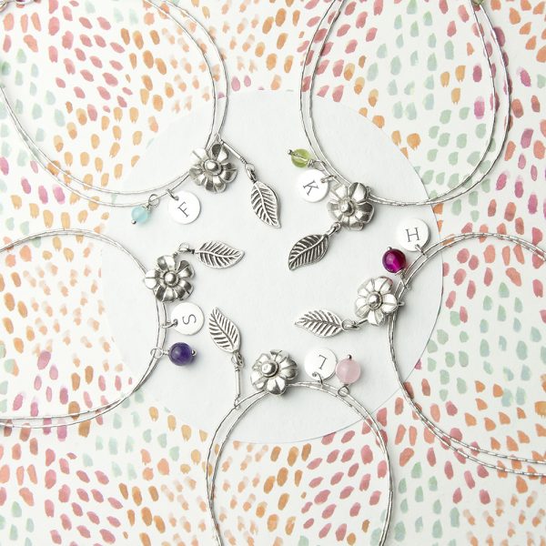 The bracelet has a total of four different charms, one with space for personalisation. The detailed Forget Me Knot and leaf designed charms add softness and the feel of friendship while the gemstones add a splash and depth of colour.