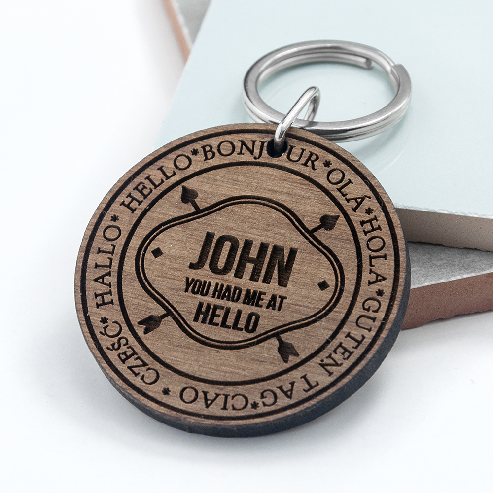 Made from strong and durable Walnut wood and crafted into a circular design, engraved with the words ‘You Had Me At Hello’ and your partners name and surrounded by the word ‘hello’ in multiple languages.