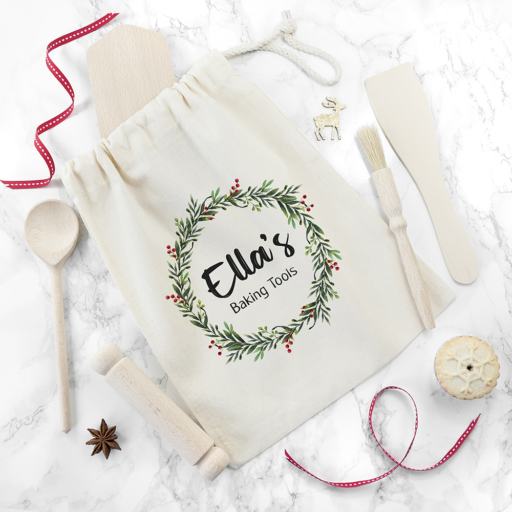 Each set contains child-friendly tools: a rolling pin, pastry brush, wooden spoon, rolling board, and a spatula; all protected within their own personalised cream drawstring bag featuring a festive ‘Home Bakery’ design.
