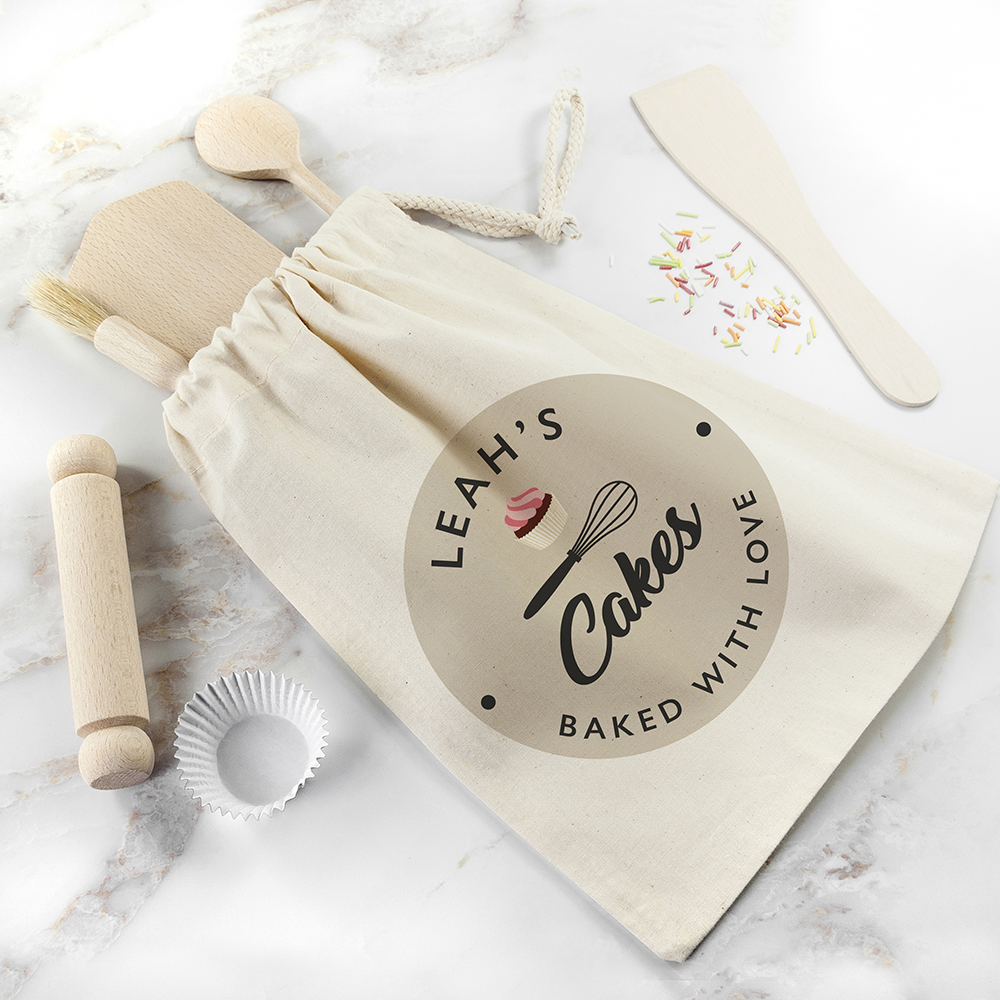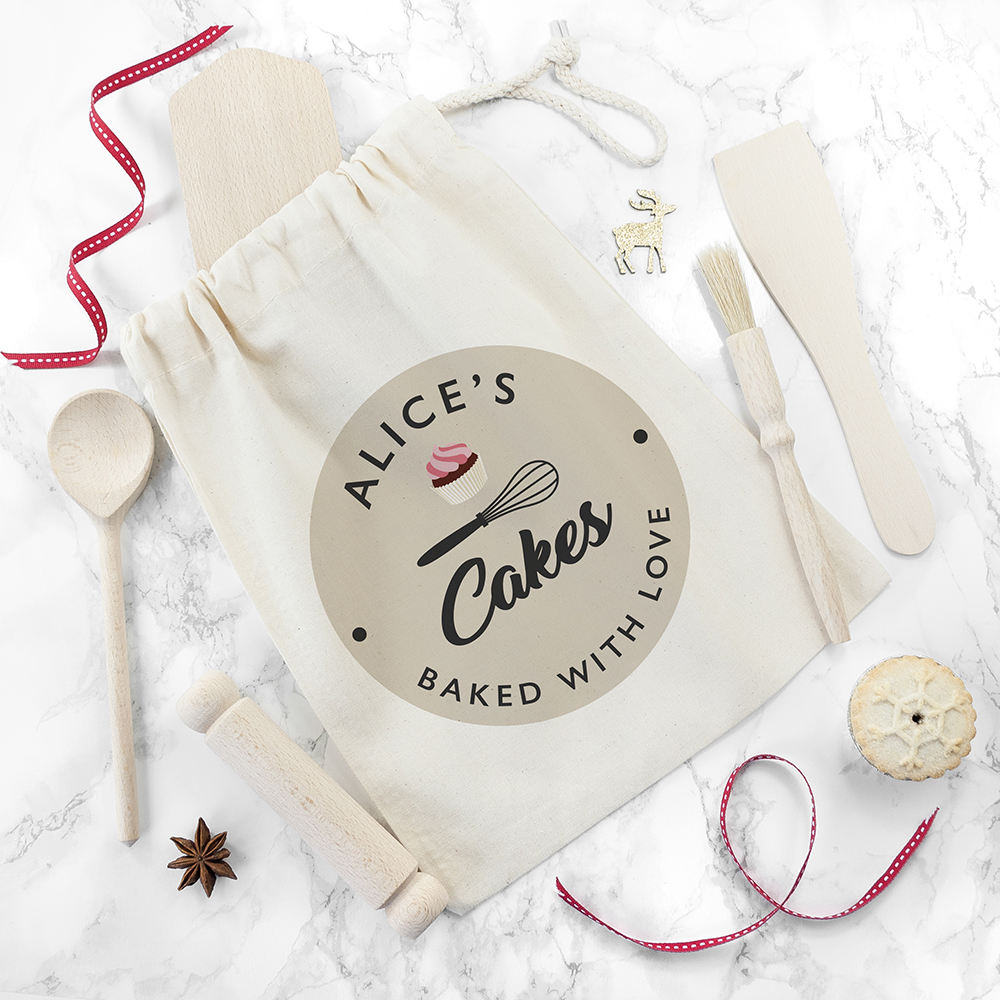 Each set contains child-friendly tools: a rolling pin, pastry brush, wooden spoon, rolling board, and a spatula; all protected within their own personalised cream drawstring bag featuring a ‘Home Bakery’ design.