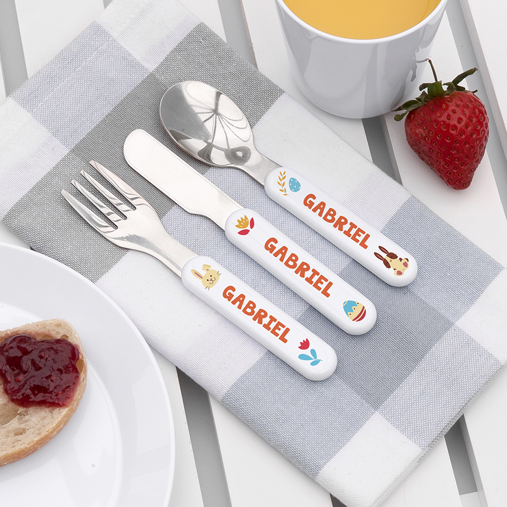 Get your little ones excited for mealtimes with their very own Personalised Metal Cutlery Set! This cute set is contians a metal fork, knife, and spoon, each with a plastic handle.