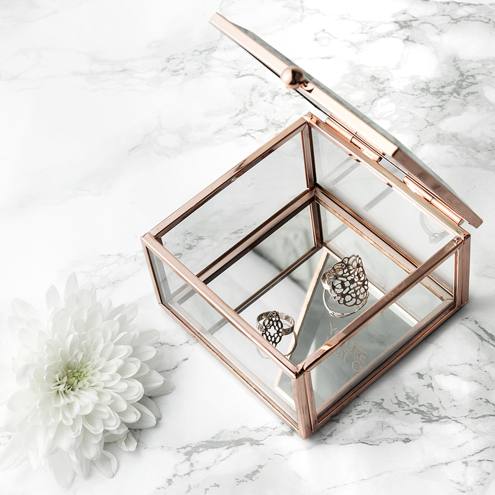 The perfect little box of sparkle for her, this rose gold edged & mirrored bottomed trinket box is the a wonderful addition to any dressing table.