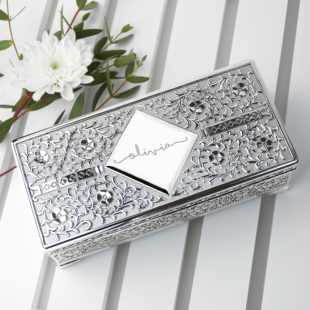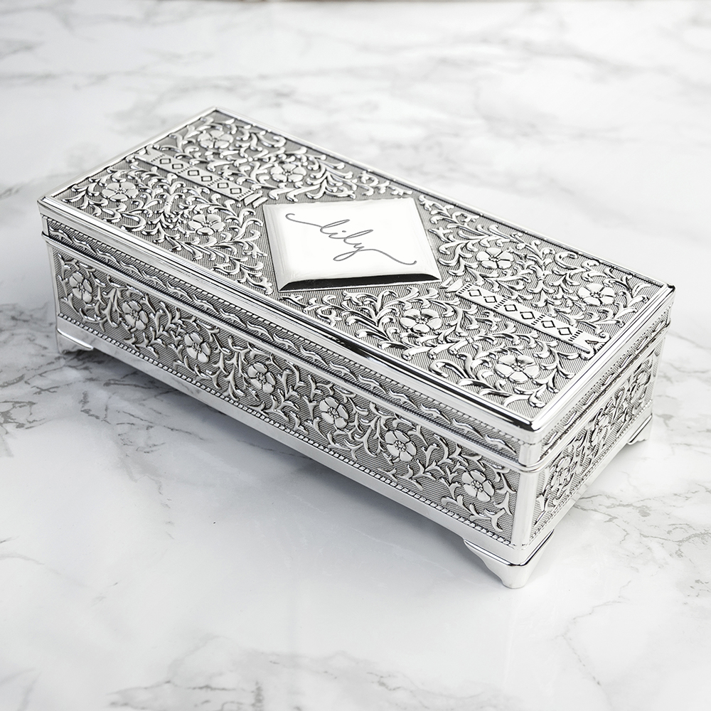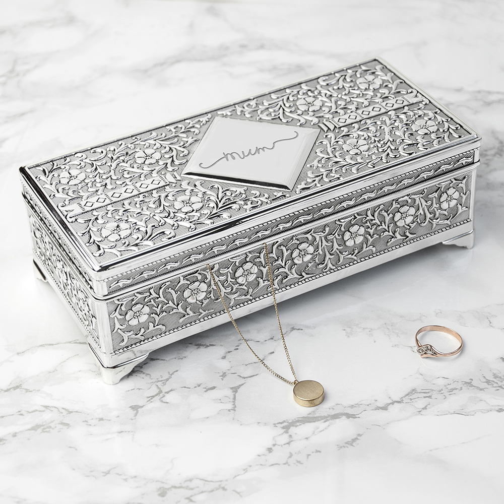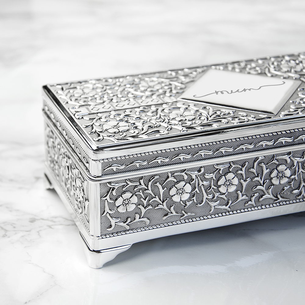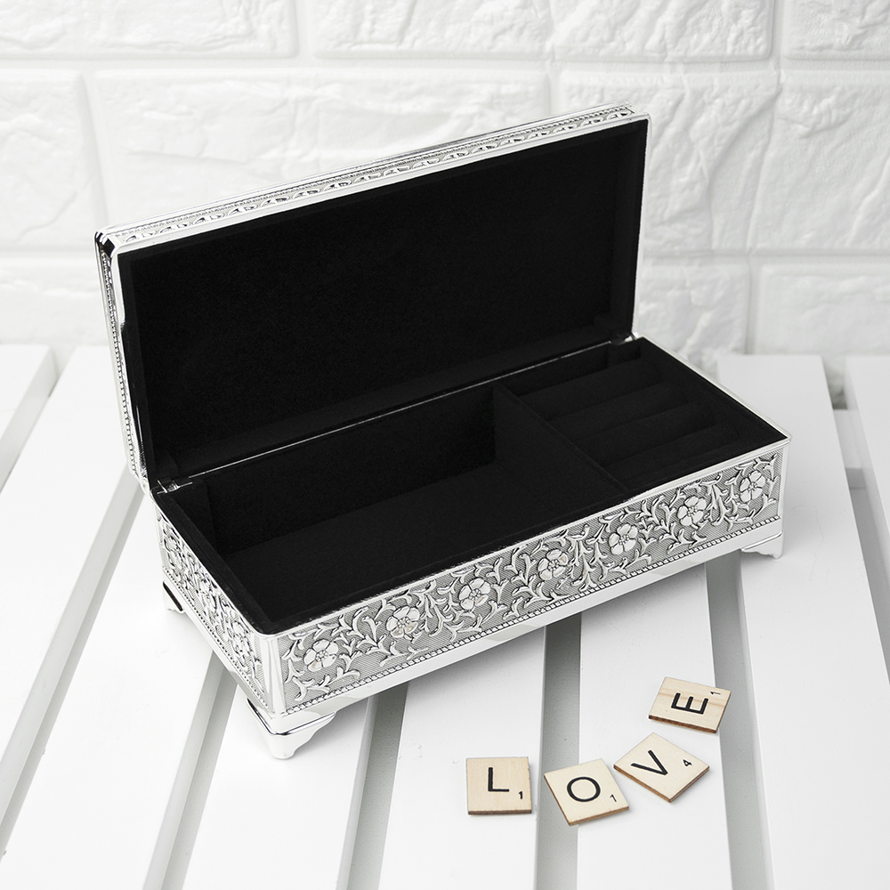 A beautiful addition to her dressing table, this ornate trinket box is the perfect place to store her most precious jewellery. Lined with black felt her jewellery will be safely protected from scratching & tarnishing. With space for rings, earrings and larger jewellery.